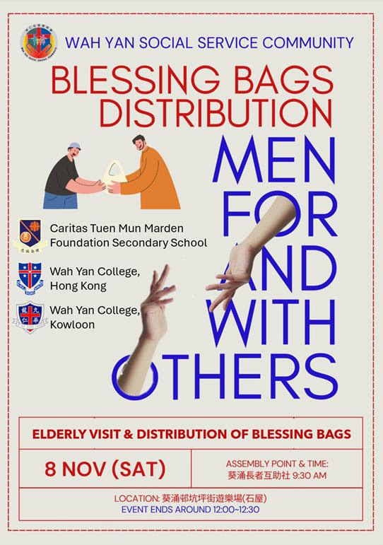 華仁社會服務團將於2025年11月8日舉辦一次關愛活動,當天會連同港九華仁書院及明愛屯門馬登基金中學的學生,探望葵涌區的獨居長者及派送福袋,歡迎各位師兄弟們參與。